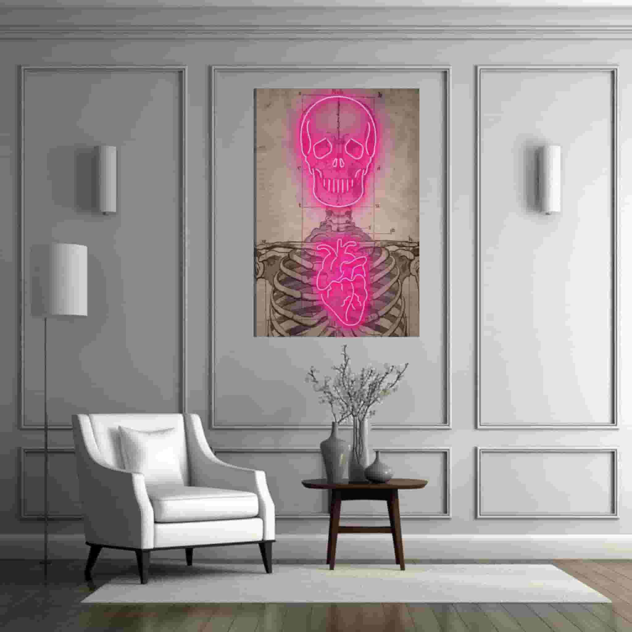 تابلو فتو نئون اسکلت، یک اثر هنری مدرن و جذاب است که با استفاده از نور نئون، تصویری از اسکلت را به نمایش میگذارد. این نوع طراحیهای تابلو فتو نئون معمولاً برای فضاهایی با تم گوتیک، هالووین یا دکوراسیونهای خاص استفاده میشوند.