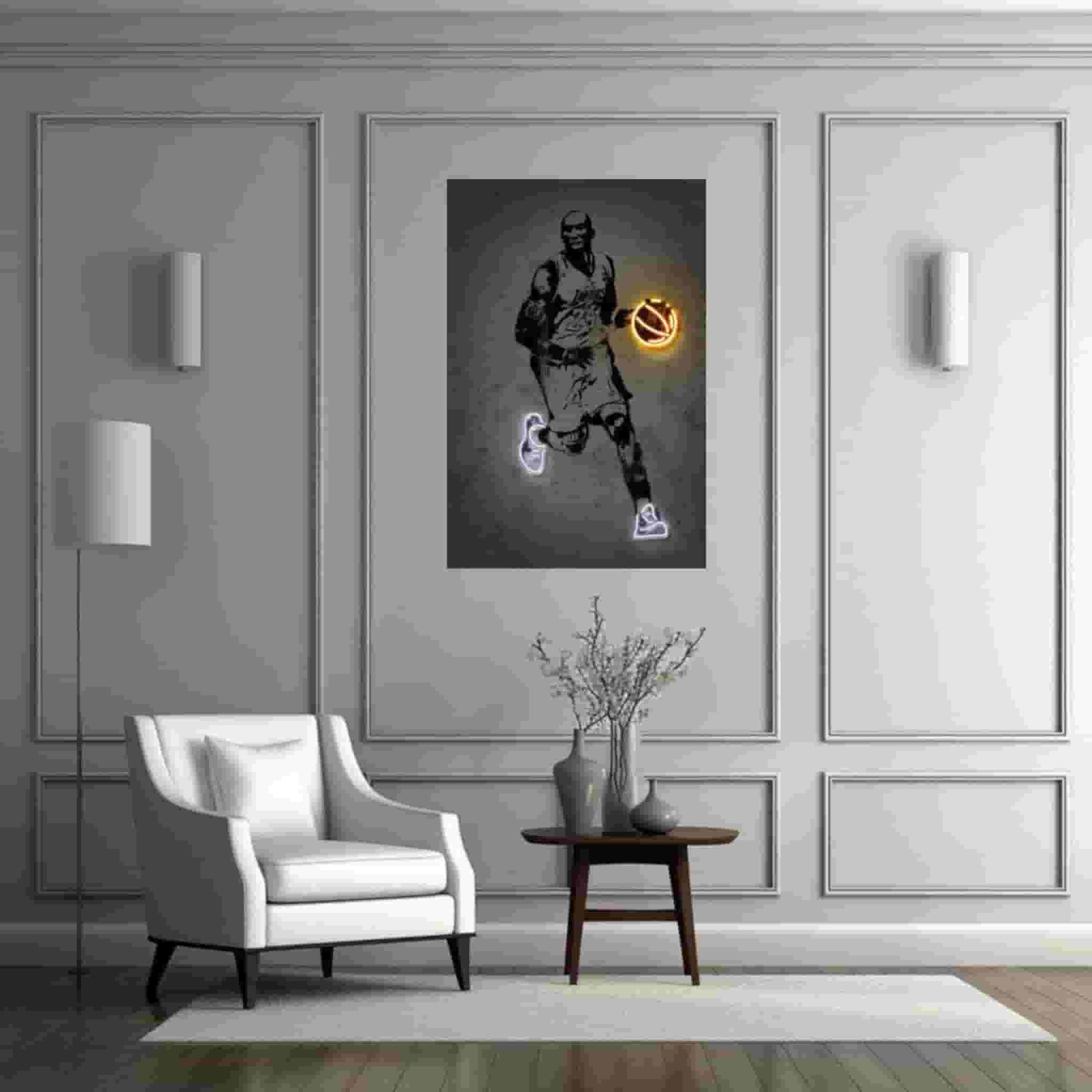 فتو نئون بسکتبالی، یک اثر هنری مدرن است که با استفاده از نور نئون، تصویری از توپ بسکتبال را به نمایش میگذارد. این طراحی با خطوط ساده و نورپردازی ملایم، فضایی ورزشی و انرژیبخش را به محیط اطراف میبخشد.